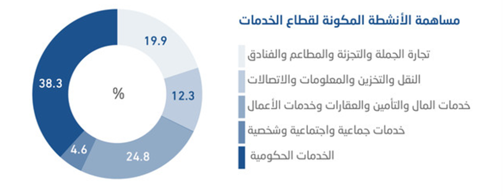 يضم الناتج المحلي لقطاع الخدمات خمسة أنشطة رئيسة وهي: تجارة الجملة والتجزئة والمطاعم والفنادق، والنقل والتخزين والمعلومات والاتصالات، وخدمات المال والتأمين والعقارات وخدمات الأعمال، وخدمات جماعية واجتماعية وشخصية، وخامسا الخدمات الحكومية. ويعد القطاع ركيزة أساسية للتنمية الاقتصادية، إلى جانب نمو القطاعين الآخرين المكونين للناتج المحلي وهما “الصناعي” و”الزراعي”