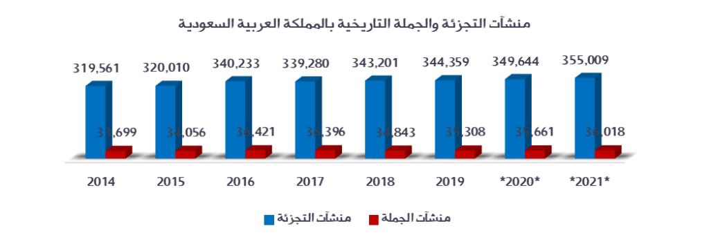 يوضح الجدول التالي أعداد منشآت التجزئة والجملة التاريخية بالمملكة العربية السعودية للأعوام 2014م :2021م طبقاً لآخر إحصاء تم نشره بالهيئة العامة للإحصاء، وقد تبين ارتفاع أعداد منشآت التجزئة والجملة لتبلغ 344,359 منشأة تجزئة لعام 2019م بمتوسط معدل نمو بلغ 1.5%، وارتفاع منشآت الجملة لتبلغ 35,308 منشأة لعام 2019م بمتوسط معدل نمو بلغ 1%.