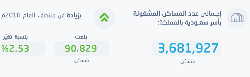 أظهرت نتائج مسح المساكن أن إجمالي عدد المساكن المشغولة بأسر سعودية بالمملكة بلغ (3,681,927) مسكن حتى منتصف عام2019م. كما تظهر النتائج بأن عدد الأفراد الذين يقطنون هذه المساكن بلغ (21,592,448) نسمة، تمثل نسبة المساكن المشغولة بأسر سعودية من إجمالي المساكن 64.85%.
