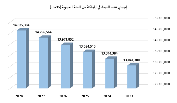 - بلغ إجمالي نساء المملكة في عام 2023 م في الفئة العمرية (15-55) 13,041,300 نسمة.