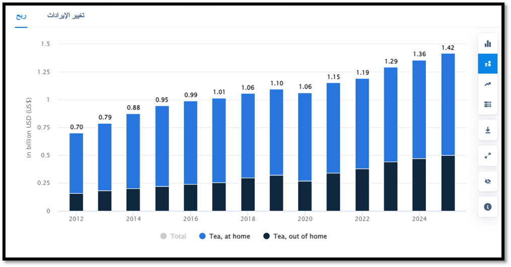 - تبلغ الإيرادات في قطاع الشاي 1.29 مليار دولار أمريكي في عام 2023. ومن المتوقع أن ينمو السوق سنويًا بنسبة 4.68٪ (معدل النمو السنوي المركب 2023-2025).