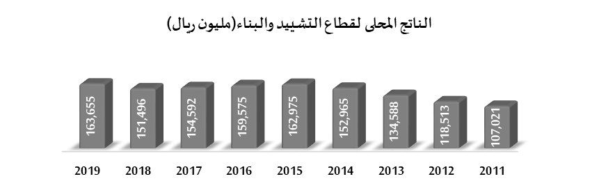 يتضح من الجدول التالي أن معدل النمو في الناتج المحلى لقطاع التشييد والبناء يتزايد بنسه 5.6% حيث أن حجم الناتج المحلى لقطاع التشييد والبناء عام 2012م بلغ 118,513 مليون ريال ثم تزايد بنسه نمو تبلغ 14% ليصبح 134,588 مليون ريال عام 2013م ثم أصبح خلال عام 2014م 152,965 مليون ريال بمعدل نمو 14 % ايضا ثم ارتفعت في 2015م لتصل الى 162,975مليون ريال بمعدل نمو بلغ 7%, وتراجع حجم الناتج المحلى الاجمالي لقطاع التشييد والبناء عام 2016م حيث انخفض بنسبة بلغت 2% فقد وصل الي 159,575 مليون ريال وبلغ في عام 2017م 154,592 مليون ريال كما تراجع أيضا بنسبة بلغت 2% بعام 2018م حيث وصل الي 151,496 مليون ريال ثم عاد الي النمو بنسبة 8% ليصل الي 163,655 مليون ريال بالعام 2019م