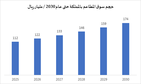 وفق “Mordor Intelligence” بلغ حجم سوق خدمات الطعام (Foodservice Market) في المملكة العربية السعودية، حيث بلغت قيمته حوالي 27.18 مليار دولار أمريكي (102 مليار ريال)في عام 2024، ومن المتوقع أن يصل إلى 42.48 مليار دولار أمريكي(159 مليار ريال) بحلول عام 2029.