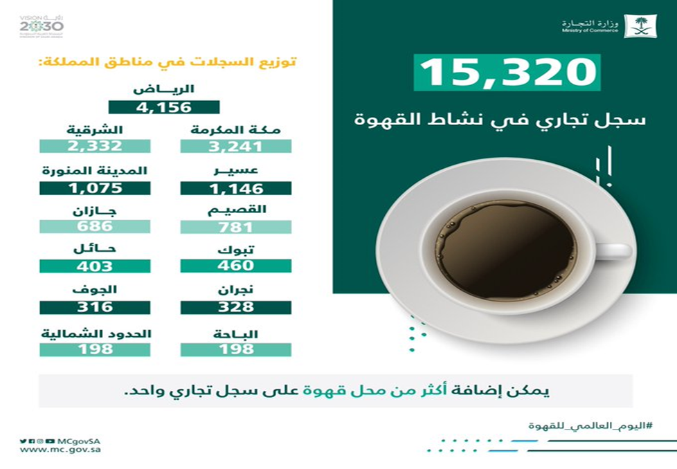 تبين وزارة التجارة والاستثمار أن إجمالي أعداد السجلات التجارية للمقاهي بالمملكة لعام 2020م بلغ حوالي 15,320 سجلًا تجاريًا